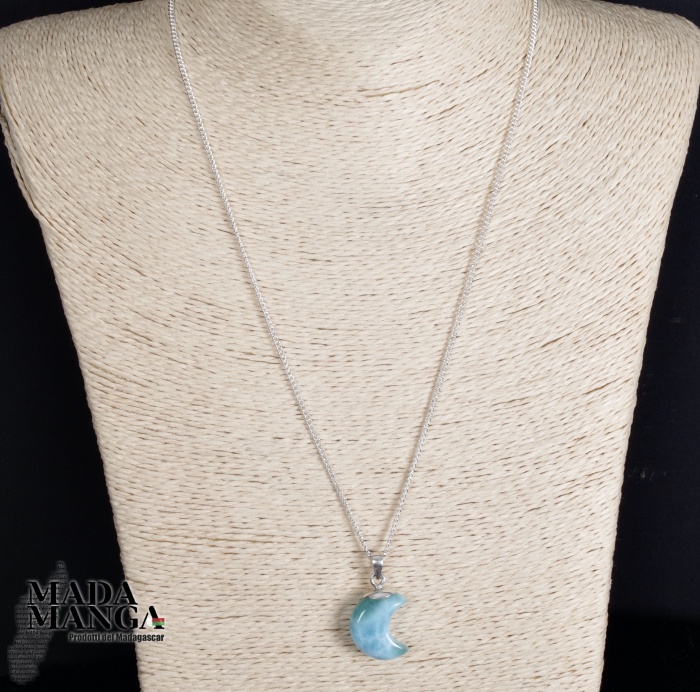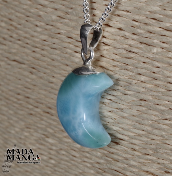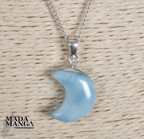 Ciondolo in Larimar di Santo Domingo a forma di luna, dimensioni mm.16x21, peso 4,7 grammi, venduto con catenina in acciaio. La confezione regalo consiste in sacchetto in tulle e scatola in carta antemoro.