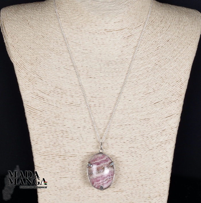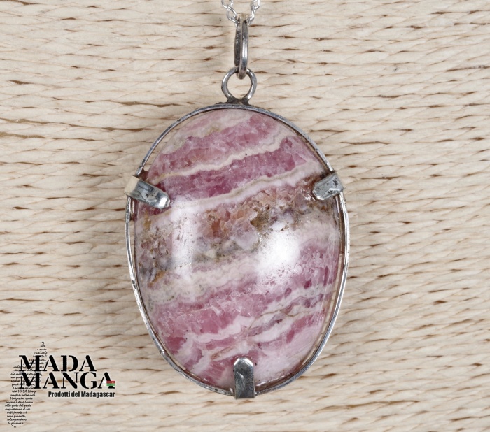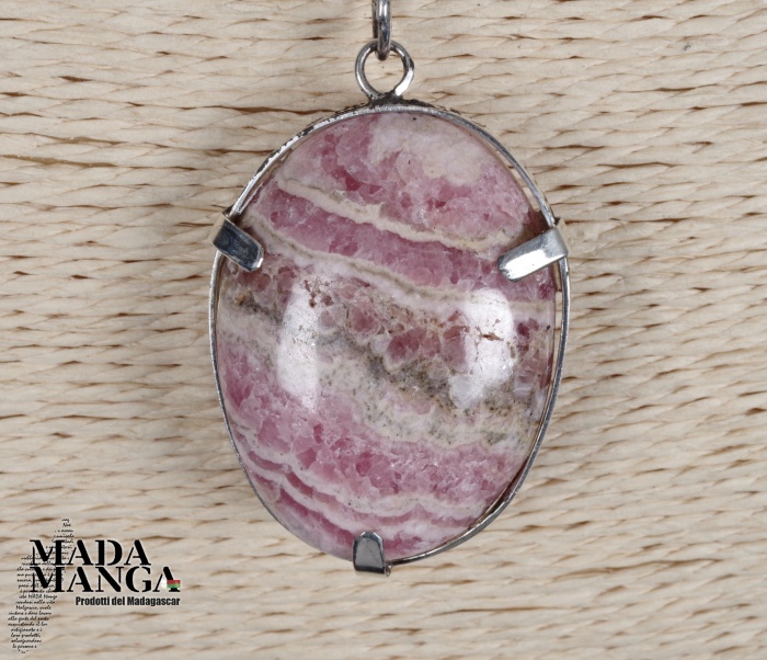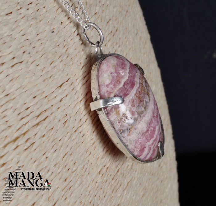 Ciondolo con Rodocrosite argentina montata in argento, dimensioni cm.2,8x3,6H, peso 28 grammi, venduto con catenina in acciaio come in foto.