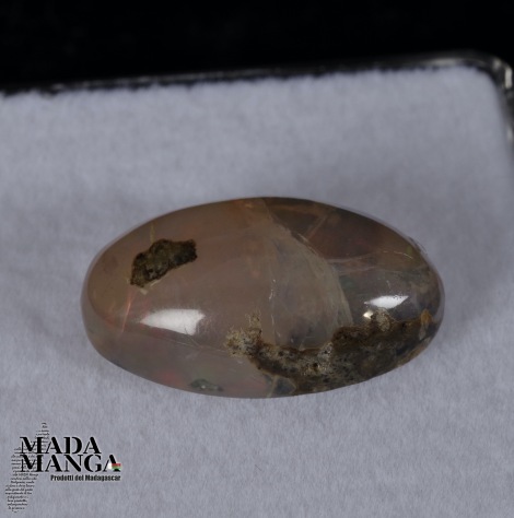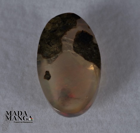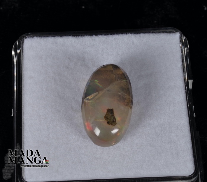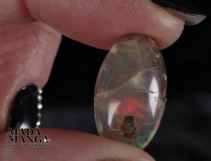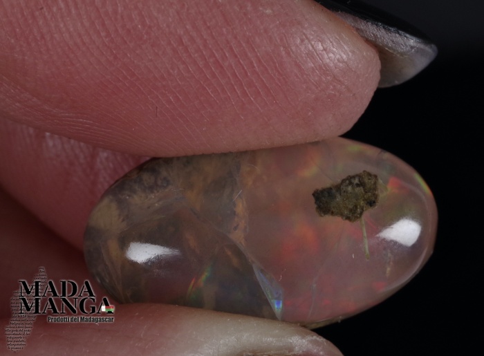 Opale etiope cabochon ovale da mm.11x19, 8,5 carati, evidenti riflessi sul verde e rosso.