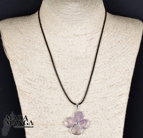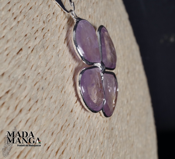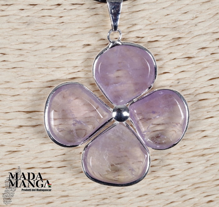 Ciondolo a forma di quadrifoglio con Ametiste, dimensioni cm.3,3x3,3H, peso 5,6 grammi, venduto con laccetto in corda cerata.