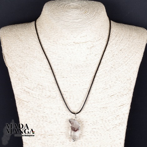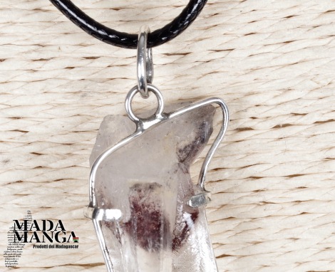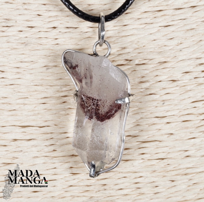 Ciondolo con Quarzo grezzo con fantasma montato in Argento, dimensioni cm.2x2,9H, peso 5,5 grammi. Venduto con laccetto in corda cerata. La confezione regalo consiste in sacchetto in tulle e scatolina in carta antemoro.
