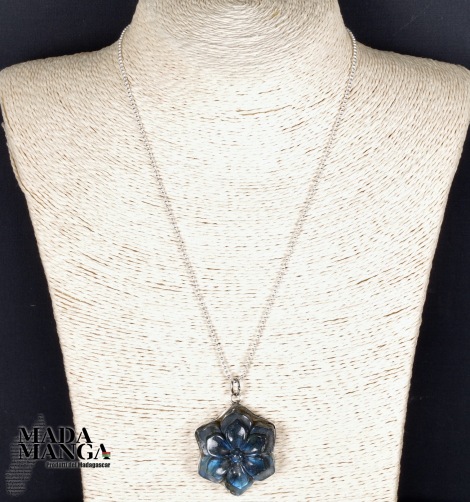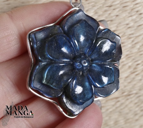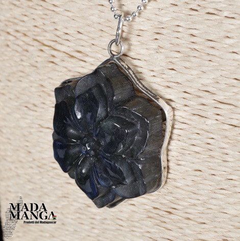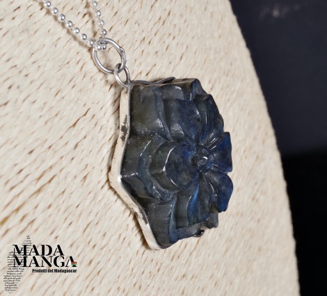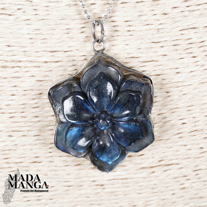 Ciondolo in Labradorite a forma di fiore con montatura in argento, dimensioni cm.3,7x3,9H, peso 21,3 grammi. Venduto con catenina in acciaio.