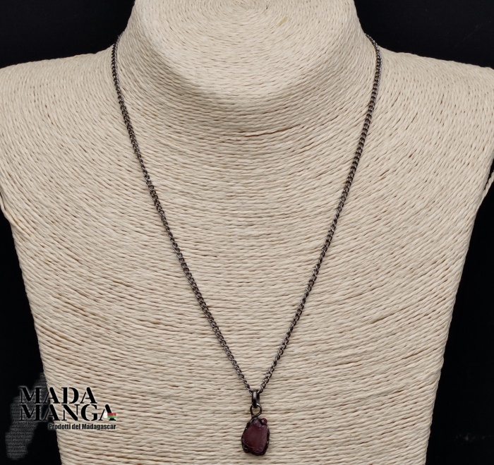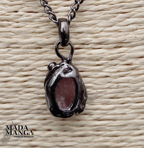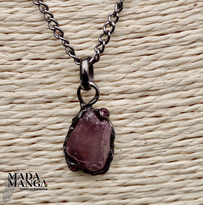 Ciondolo in Argento 925 rodiato con rodio nero, con Rubino grezzo e due piccole rodoliti, dimensioni cm.1,1x1,5H + gancio.