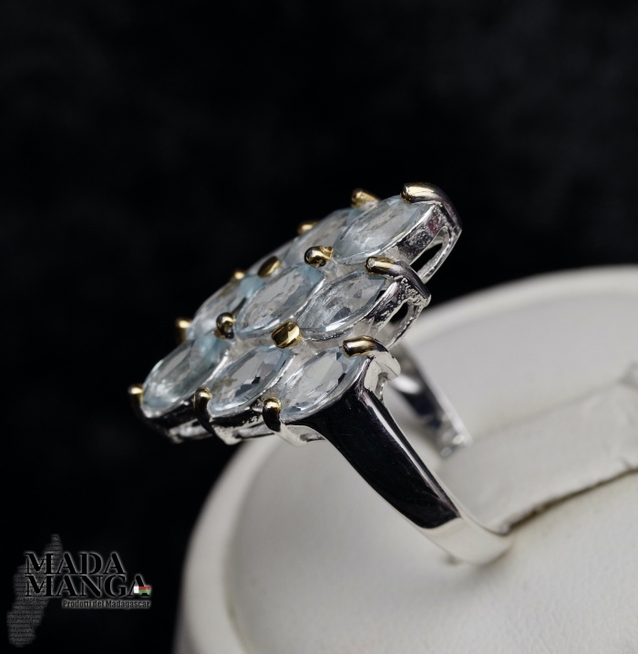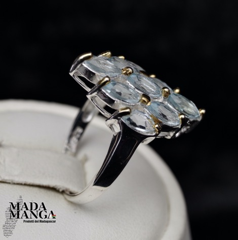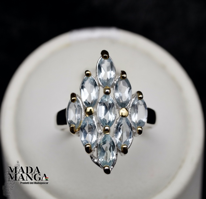 Anello in Argento 925 con placcature in oro giallo, con n°9 topazi taglio marquise da mm.6x3. Misura americana 6,5, misura italiana 14, diametro interno mm.17,10, peso anello 3,8 grammi. Venduto con scatolina regalo. L'anello è realizzato artigianalmente in pezzo unico per modello e misura.