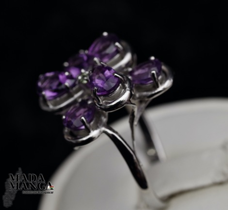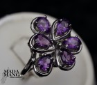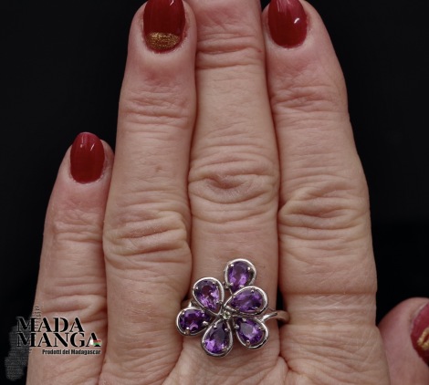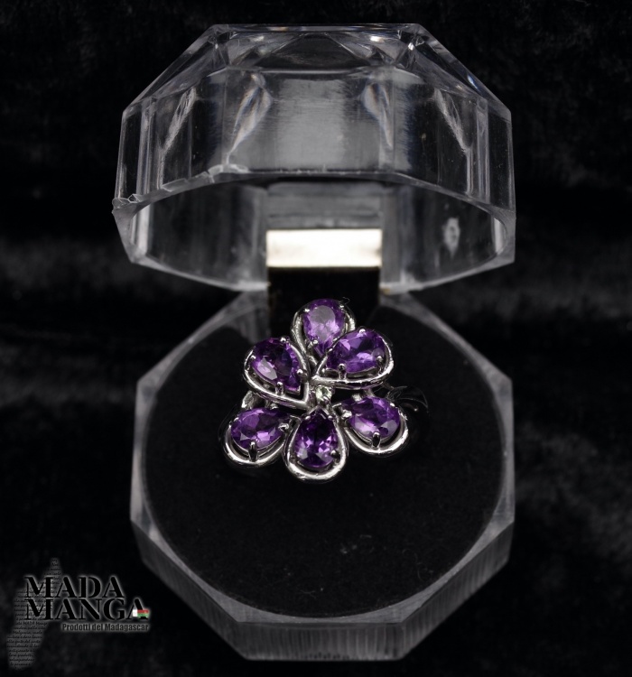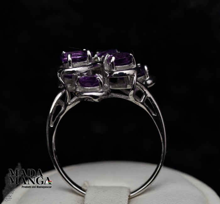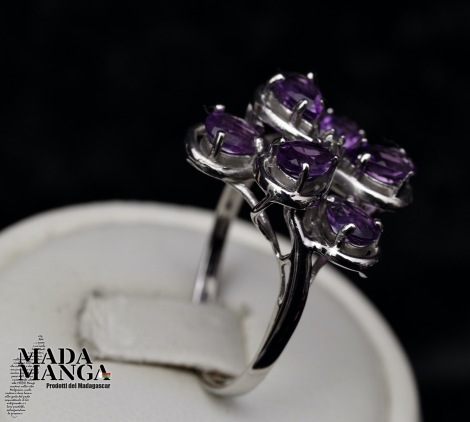 Anello in Argento 925, con placcature in oro bianco, con n°6 ametiste taglio pear, peso anello 3,6 grammi. Misura americana 9 misura italiana 20, diametro interno mm.19. Venduto con scatolina regalo. L'anello è realizzato artigianalmente in pezzo unico per modello e misura.