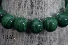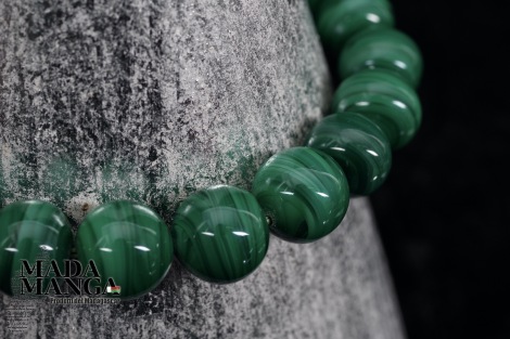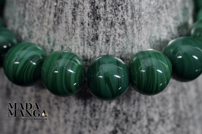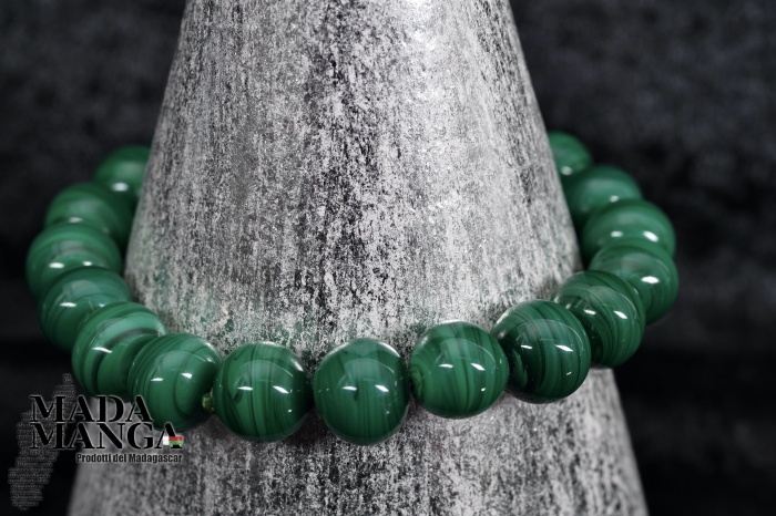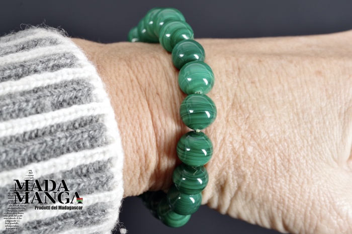 Braccialetto elastico in malachite, elementi tondi da mm.10, diametro interno cm.5, peso 32,8 grammi. La confezione regalo consiste in sacchetto in tulle e scatolina in carta antemoro.