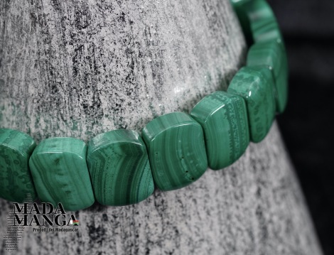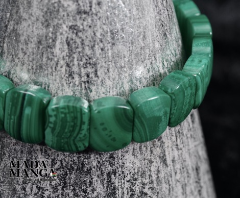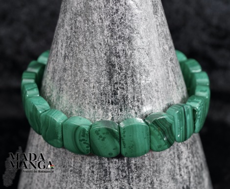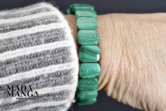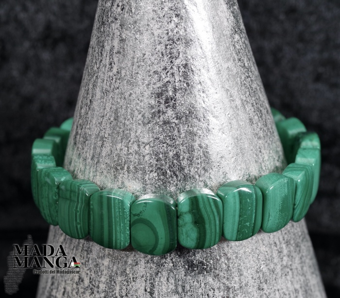 Braccialetto elastico in malachite, elementi piatti da mm.12x9, diametro interno cm.5, peso 34 grammi. La confezione regalo consiste in sacchetto in tulle e scatolina in carta antemoro.