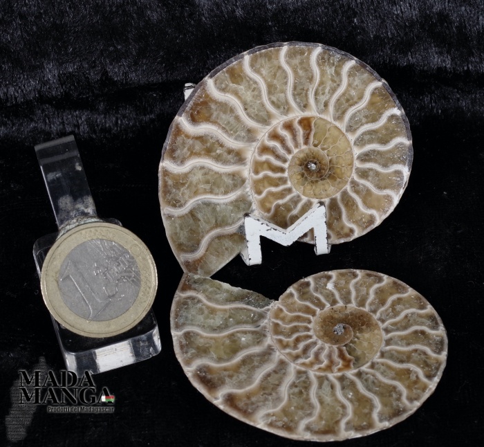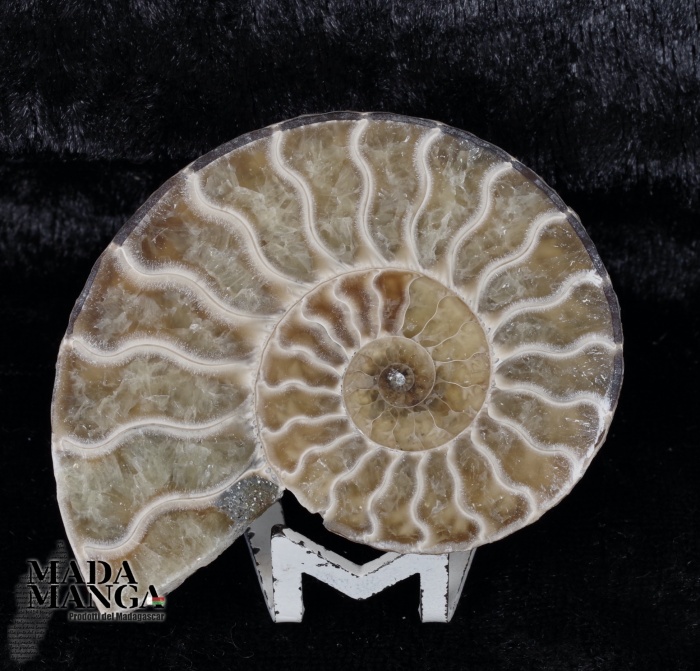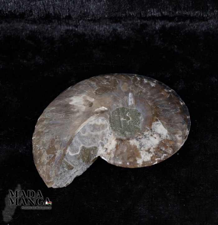 Ammonite tagliata e lucidata, bellissima definizione dei setti di crescita con inclusioni di calcite, dimensione cm.5,6x4,2x1,3 spessore peso 45 grammi. Provenienza Madagascar
