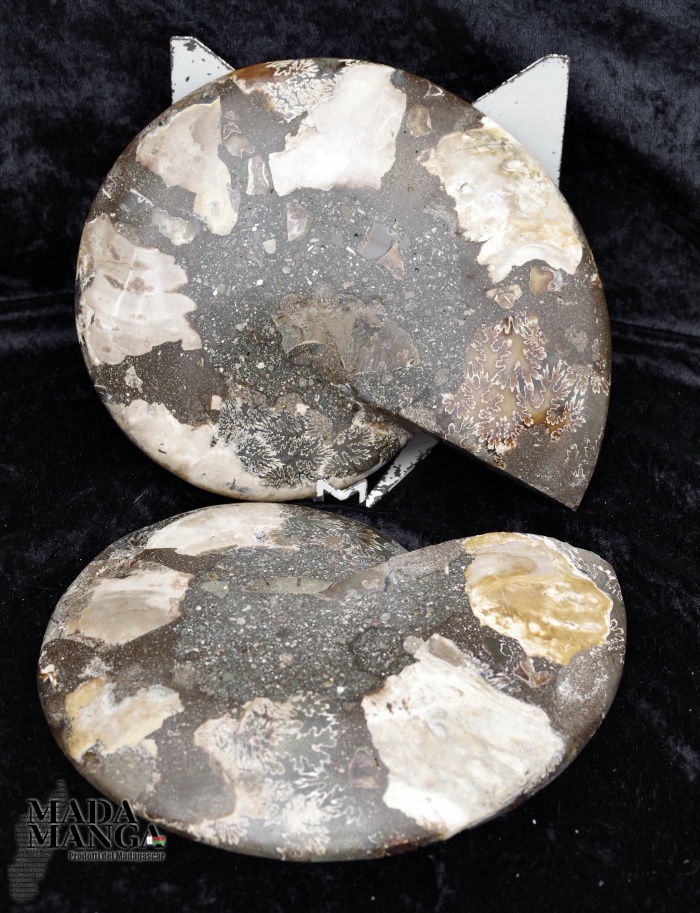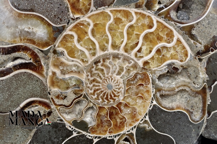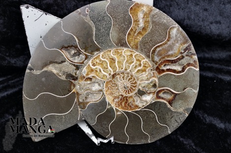 Ammonite tagliata e lucidata, bella definizione dei setti di crescita con piccoli geodi, dimensione cm.19x15,3x4,2 spessore, peso 1523 grammi. Provenienza Madagascar