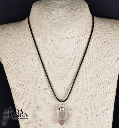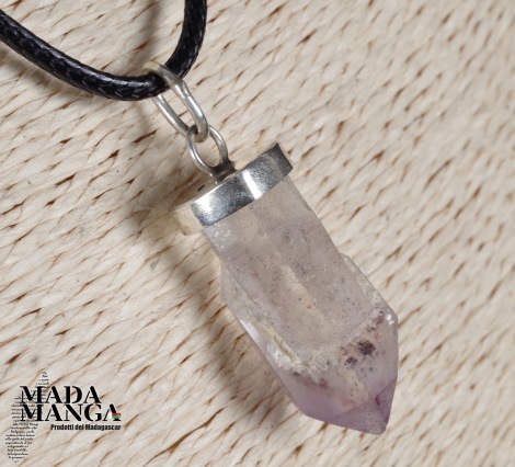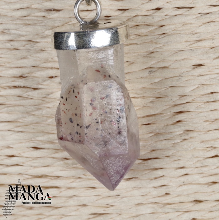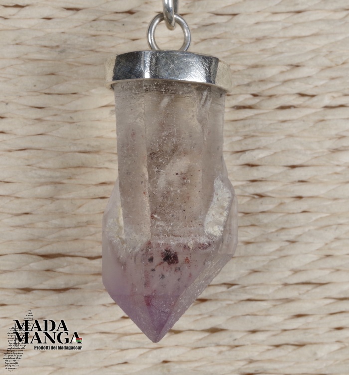 Ciondolo con scettro di Ametista con inclusione di lepidocrociti, montato con cappuccio in Argento, dimensioni cm.1,2x2,7H, peso 6,1 grammi. Venduto con laccetto in corda cerata. La confezione regalo consiste in sacchetto in tulle e scatolina in carta antemoro.