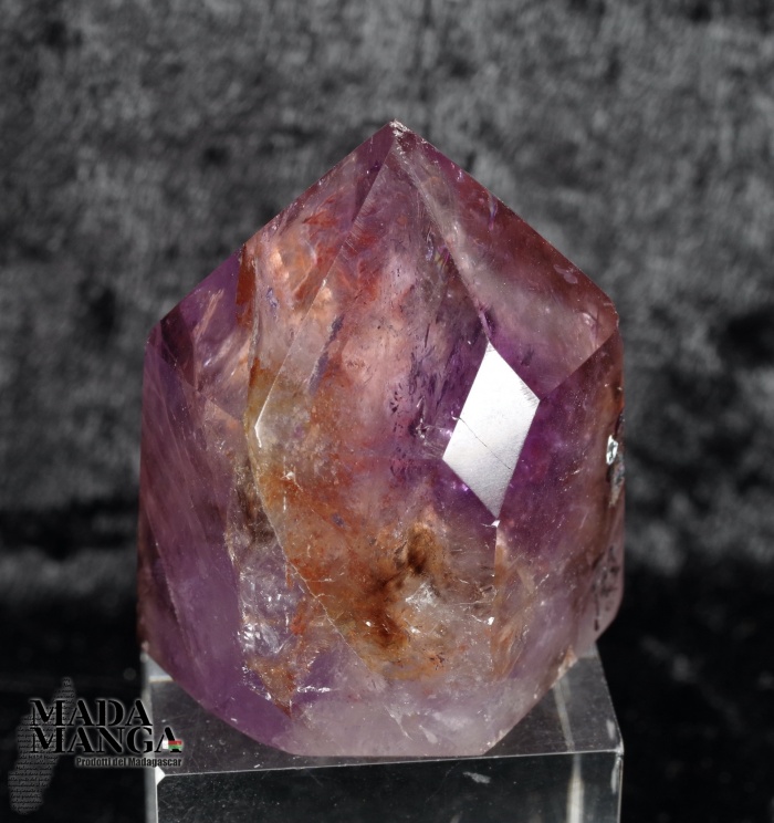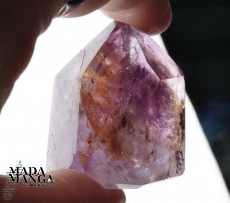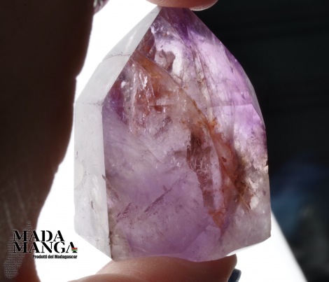 Punta di Ametista con velature fumè ed ematoidi e con time link destro, dimensione cm.2,7x3,2x4H, peso 48,3 grammi. Provenienza Madagascar
