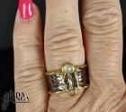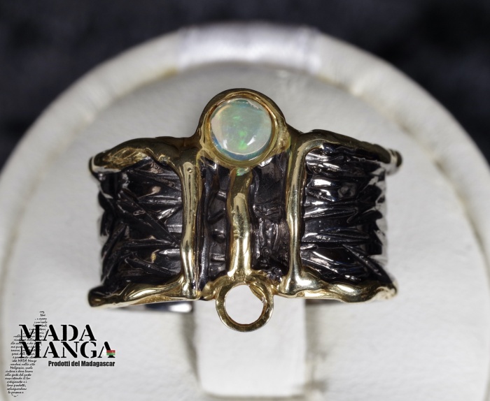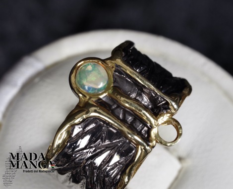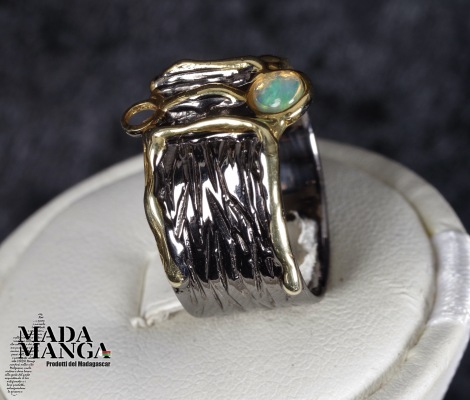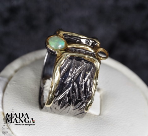 Anello in Argento 925 rodiato con rodio nero e con placcature in oro giallo, con opale etiope da mm.4x4. Misura americana 7, misura italiana 15, diametro interno mm.17,35, peso anello 5,9 grammi. Venduto con scatolina regalo. L'anello è realizzato artigianalmente in pezzo unico per modello e misura.