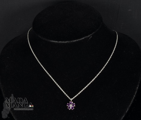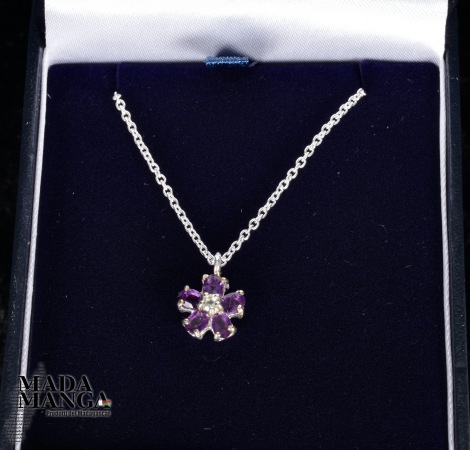Collana in Argento 925 con pendente a forma di fiore da mm.10x10 con Ametiste e Topazio centrale, lunghezza catenina cm.46, peso 3,7 grammi. Venduta con scatolina regalo.