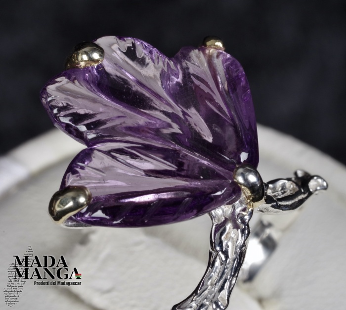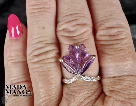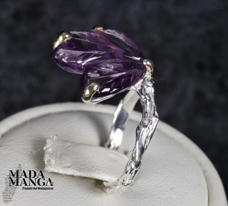 Anello in Argento 925 con placcature in oro giallo, con Ametista lavorata a forma di foglia da mm.17x13, peso anello 4 grammi. Misura americana 7,5, misura italiana 16, diametro interno mm.17,75. Venduto con scatolina regalo. L'anello è realizzato artigianalmente in pezzo unico per modello e misura.