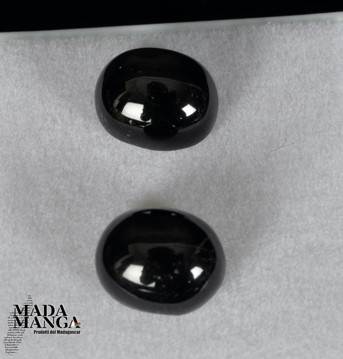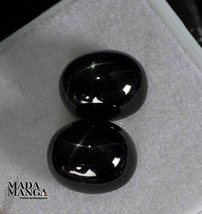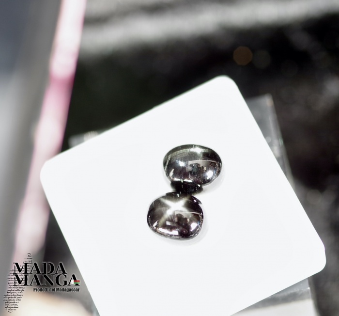 Coppia corindoni neri stellati (zaffiri), stella a 4 raggi, taglio cabochon, dimensioni mm.13x14x7 spessore ciascuno, totale 16,6 carati.