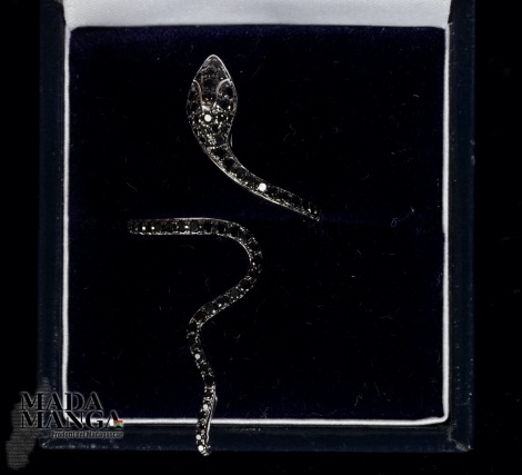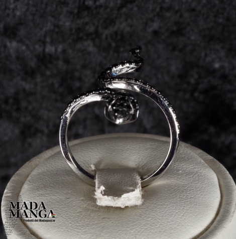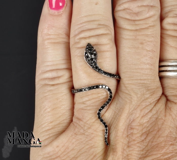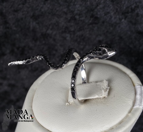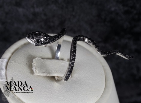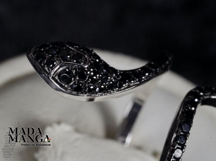 Anello a forma di serpente in Argento 925 con placcature in oro bianco, con spinelli neri. Misura americana 7, misura italiana 15, diametro interno mm.17,35, peso anello 2,3 grammi. Venduto con scatolina regalo. L'anello è realizzato artigianalmente in pezzo unico per modello e misura.