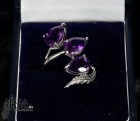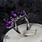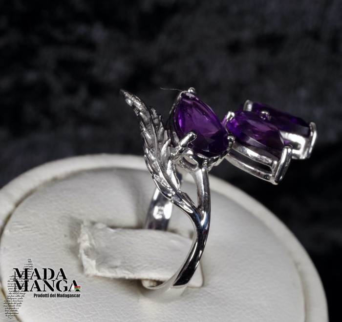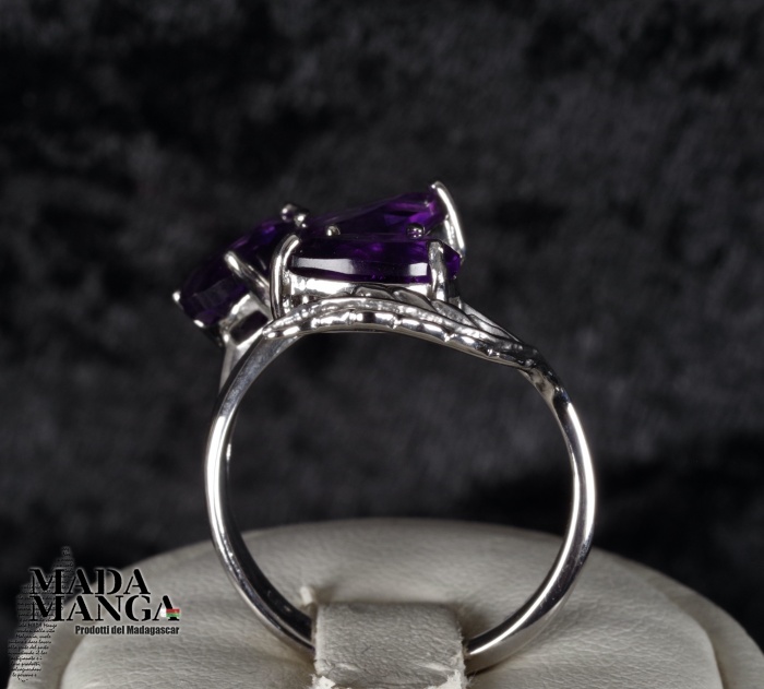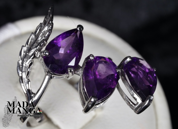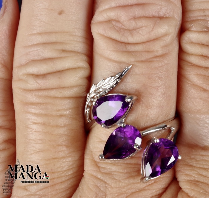 Anello in Argento 925 con placcature in oro bianco, con tre ametiste taglio pear da mm.8x6. Misura americanana 8 , misura italiana 17, diametro interno mm.18,19. peso anello 3,9 grammi. Venduto con scatolina regalo. L'anello è realizzato artigianalmente in pezzo unico per modello e misura
