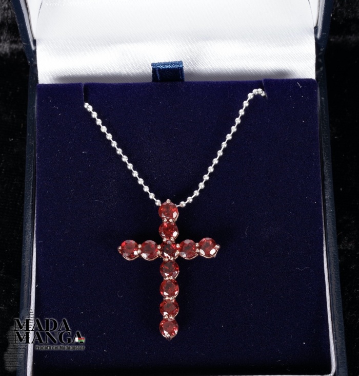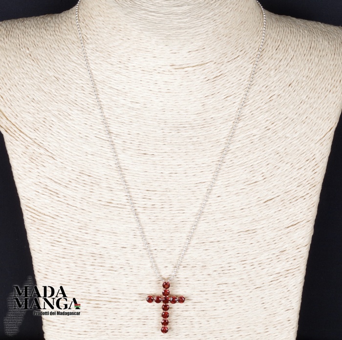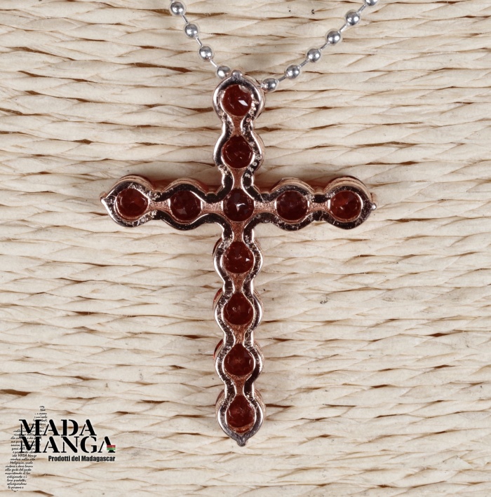 Ciondolo a forma di croce in Argento 925 con placcature in oro rosa con n°11 granati da mm.4x4, dimensioni mm.20x30H + gancio. Peso 2,1 grammi. Venduto con scatolina regalo e catenina placcata argento.