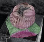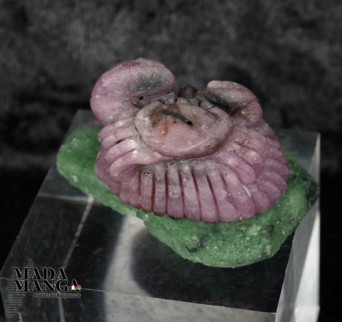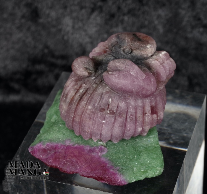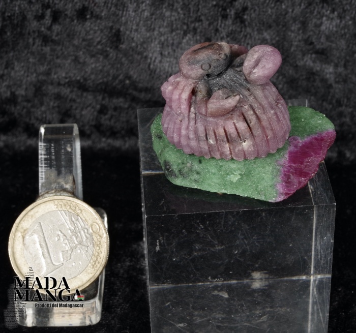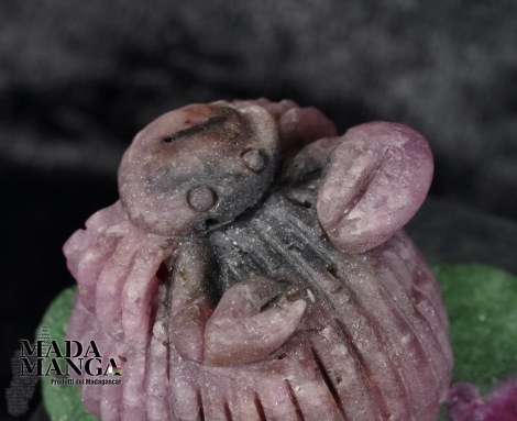 Granchio su conchiglia realizzato con radice di rubino e base in ruby-zoisite, dimensioni cm.4,1x3,2x2,3, peso 37,2 grammi.