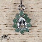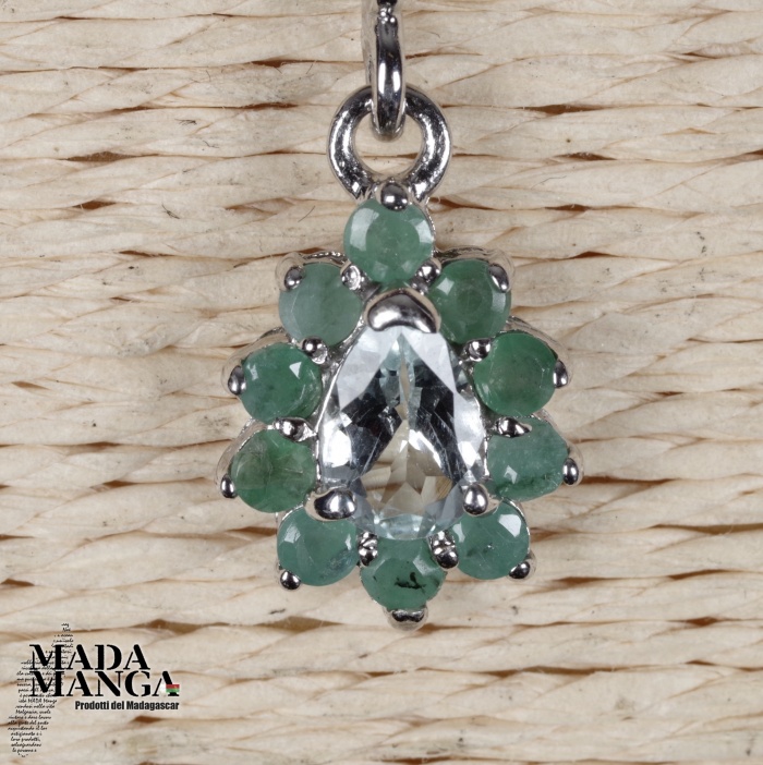 Collana in Argento sterling 925 con placcature in oro bianco, con acquamarina taglio pear da mm.7x5, contornata da smeraldi, motivo floreale con rodoliti.