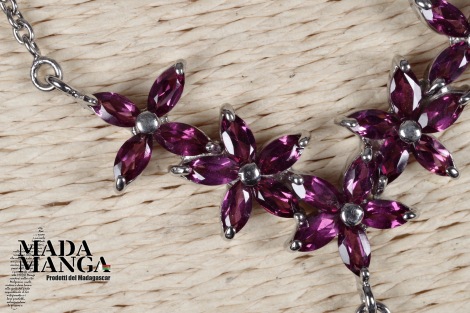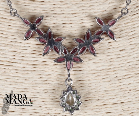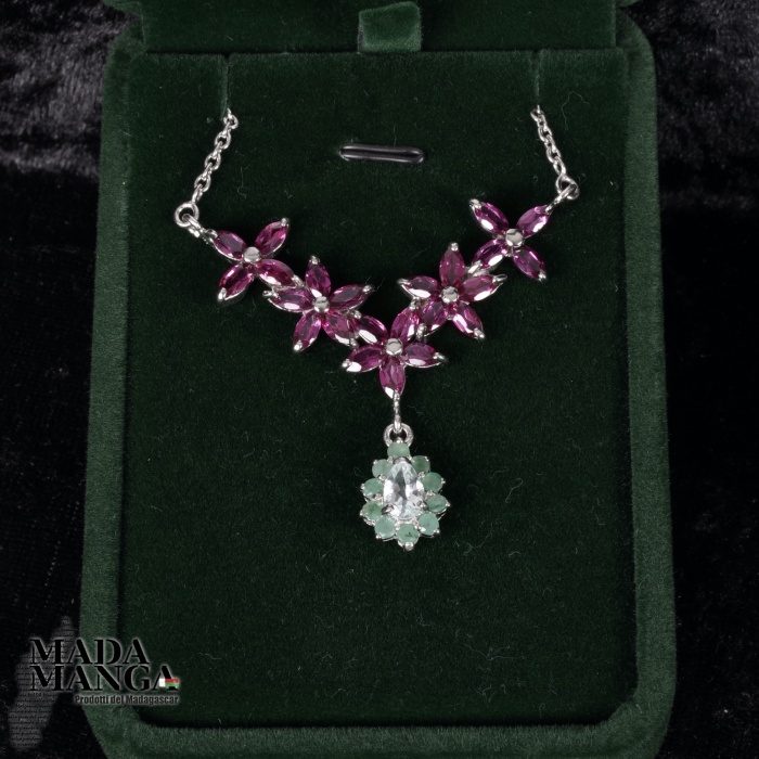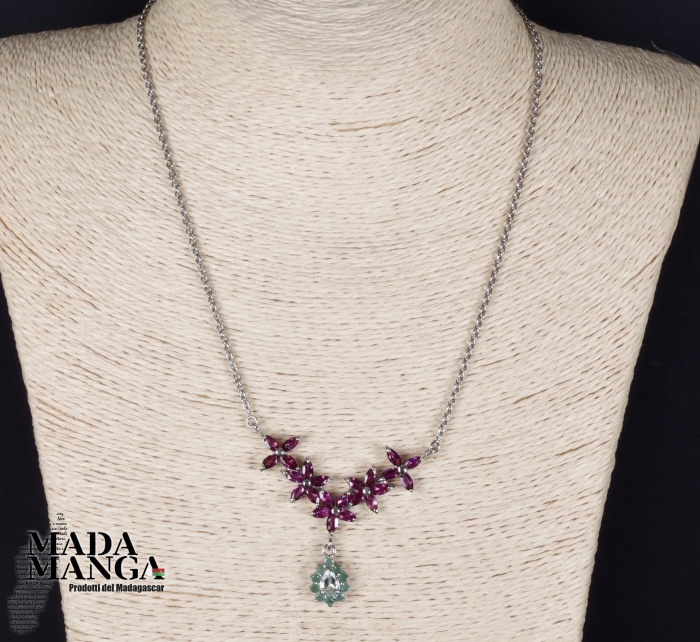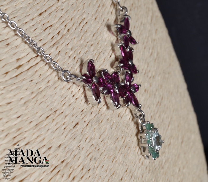 Collana in Argento sterling 925 con placcature in oro bianco, con acquamarina taglio pear da mm.7x5, contornata da smeraldi, motivo floreale con rodoliti. Dimensione parte con pietre cm.4,3x4,7, lunghezza collana cm.48, peso 14,1 grammi. Venduta con scatolina regalo.