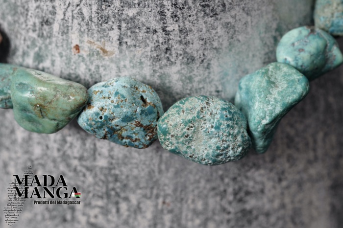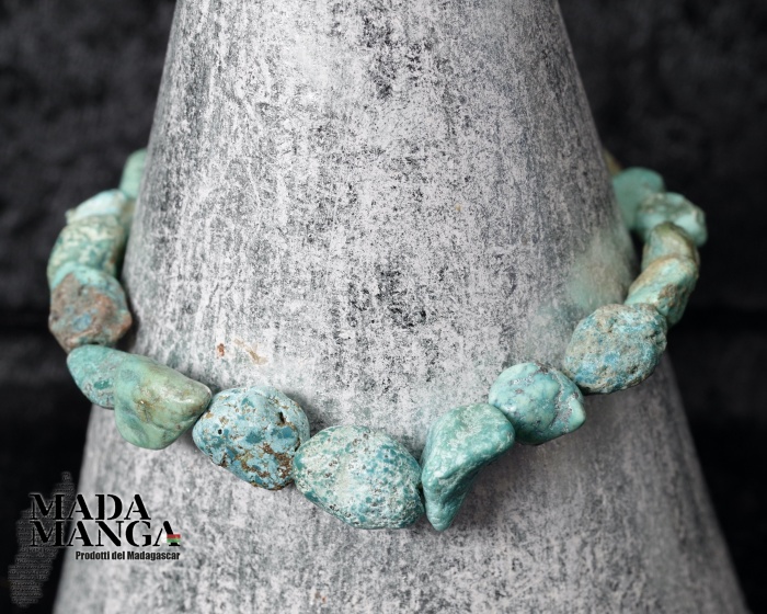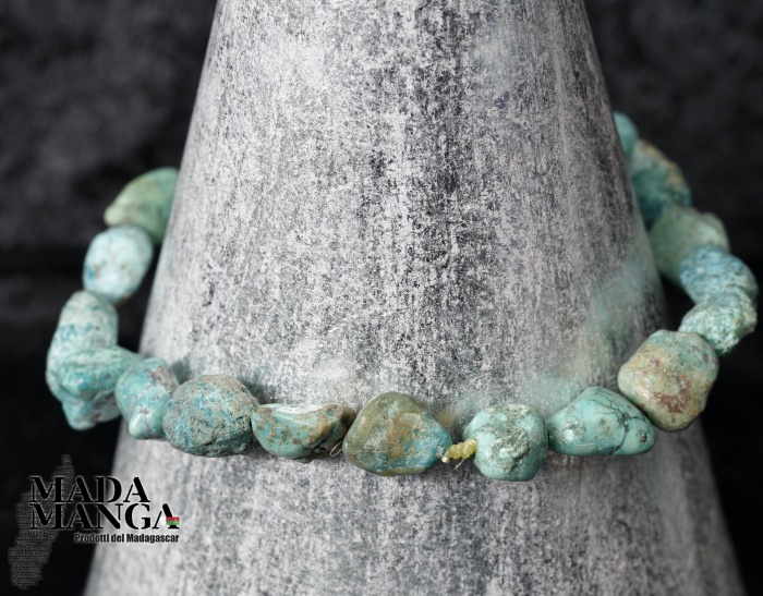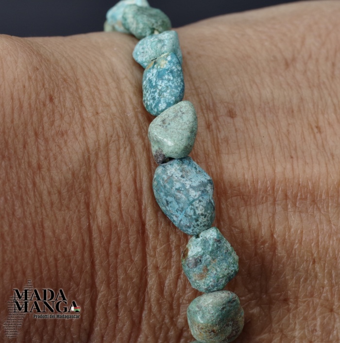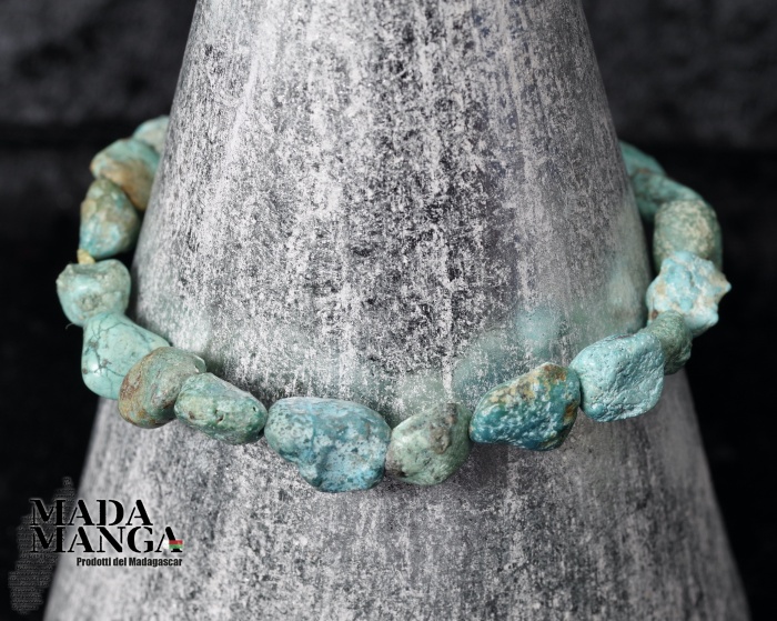 Braccialetto elastico realizzato con turchesi grezzi, diametro interno cm.5,5 peso 13,7 grammi. La confezione regalo consiste in sacchetto in tulle e scatolina in carta antemoro.
