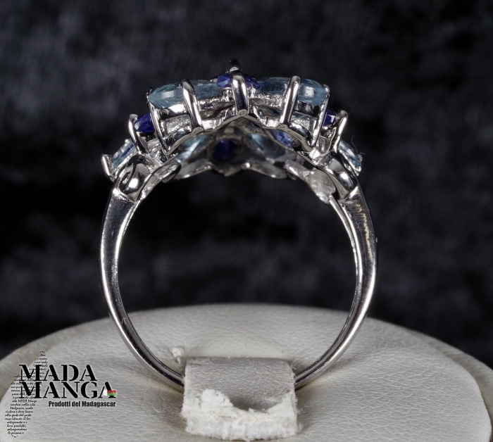 Anello in Argento 925 con placcature in oro bianco, con rodolite centrale da mm.6x4, con tanzaniti taglio marquise e acquemarine taglio pear. Misura americana 7, misura italiana 15, diametro interno mm.17,35, peso anello 3,2 grammi. Venduto con scatolina regalo. L'anello è realizzato artigianalmente in pezzo unico per modello e misura.