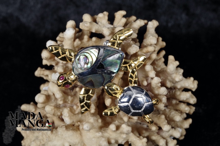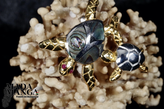 Spilla/ciondolo a forma di tartarughe in argento 925 con placcature in oro giallo, con abalone e occhi in rubini. Dimensioni cm.5,1x4,4, peso 3,8 grammi. Venduta con scatolina regalo.