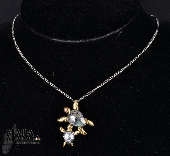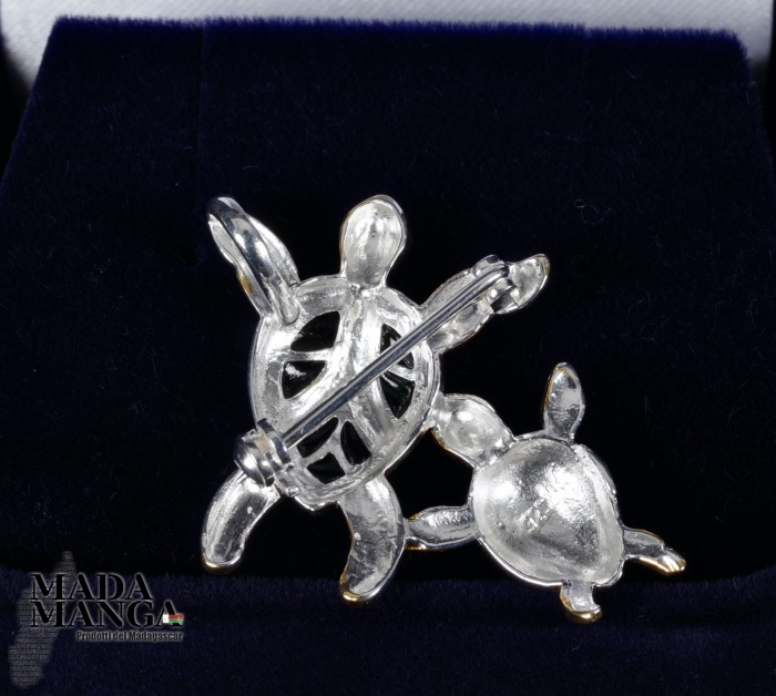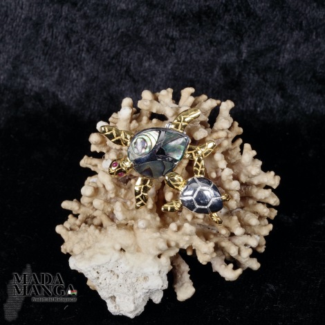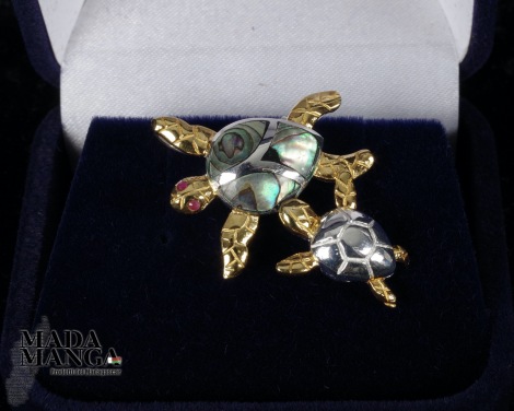 Spilla/ciondolo a forma di tartarughe in argento 925 con placcature in oro giallo, con abalone e occhi in rubini.
